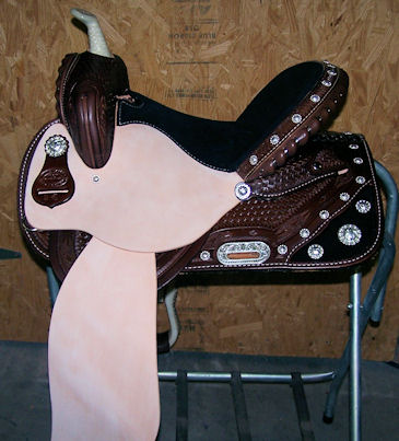 Square skirt, Round front, Purple Seat and Crystals, hand carved with Oak leaf design, hand carved Diamond border on seat and fenders, and includes silver rigging plates and extra conchos.